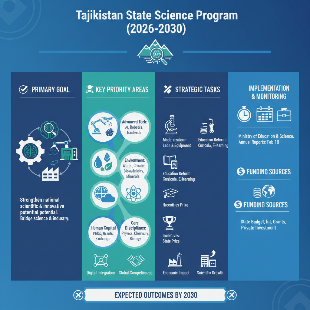 The primary goal of the Program is to strengthen the scientific and innovative potential of Tajikistan by fostering fundamental and applied research. It aims to align scientific output with the current needs of the national economy, specifically focusing on: